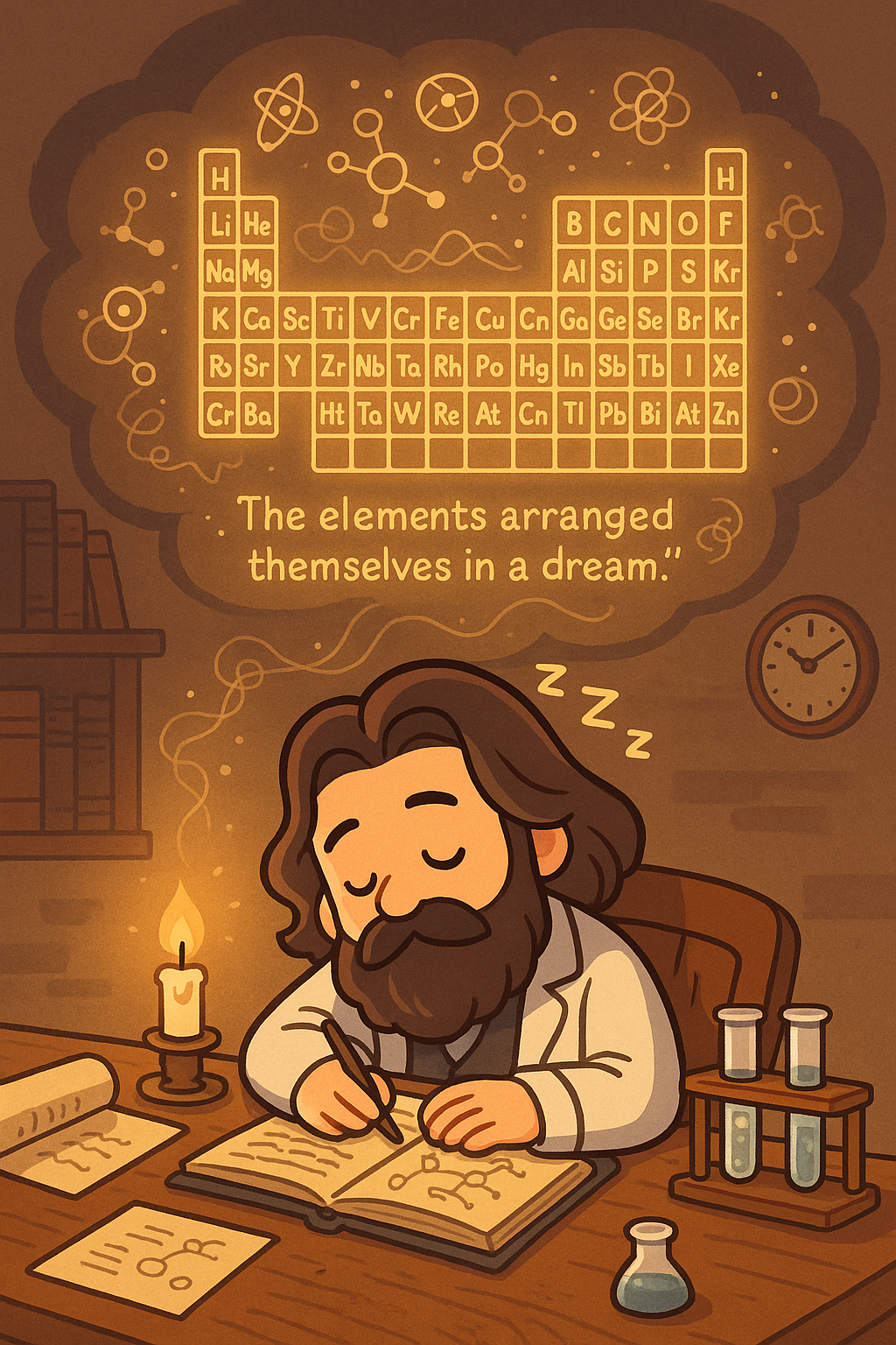 ตารางธาตุไม่ได้ถือกำเนิดขึ้นในห้องทดลองเพียงอย่างเดียว หากยังเกิดขึ้นในจิตใจของนักวิทยาศาสตร์ที่มีความใฝ่รู้และไม่ยอมแพ้ แม้ในยามหลับ ความตั้งใจของเมนเดเลเยฟก็ยังคงทำงาน